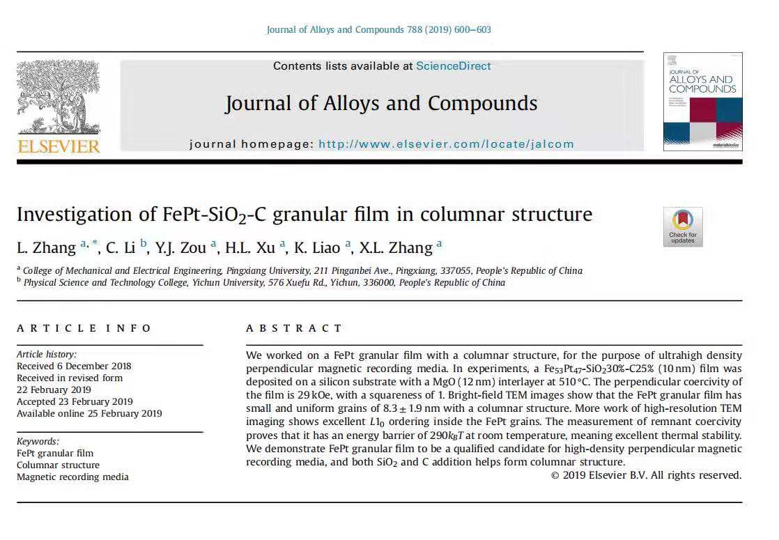 近日,永利集团88304官网集团新进教师、大学物理教学中心主任章黎博士在欧洲Elsevier旗下的知名期刊《合金和化合物杂志》(Journal of Alloys and Compounds)上发表题为“Investigation of FePt-SiO2-C Granular Film in Columnar Structure”的科技论文。《合金和化合物杂志》为SCI二区科技期刊(最新影响因子3.779),在全球材料科学领域有着重要的影响。章黎博士的论文阐述了FePt纳米材料作为下一代电脑硬盘存储媒质性能的优越性,是我校教师开展应用技术研究的又一重要成果。