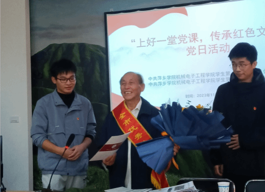 活动首先,同学们对江福星爷爷的到来表示了热烈的欢迎,预备党员罗鑫坤向江福星同志送上了机电学院学生党支部自制的印有支部介绍与支部荣誉的纪念卡片,预备党员万乐峰向江福星同志送上了花束。