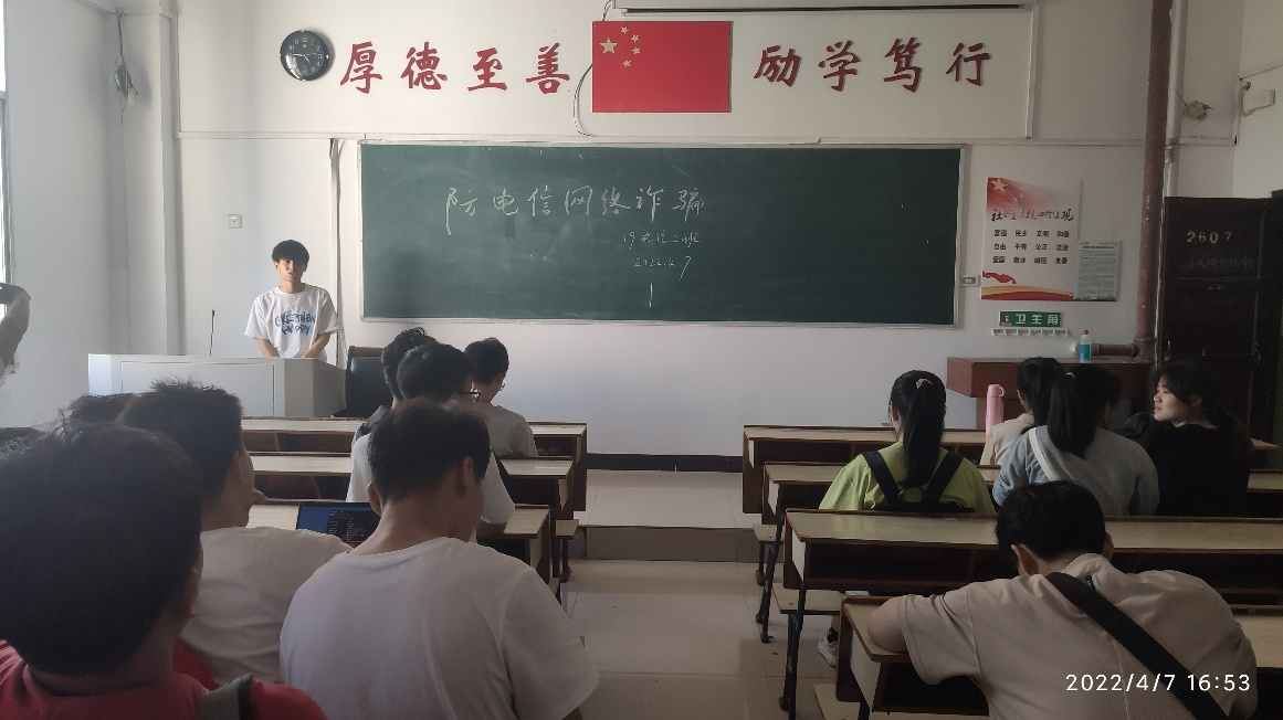 2022年4月8日,为响应学校平安建设活动月主题宣传活动,增强学生防诈骗意识,杜绝校园内电信诈骗事件的发生,电子信息工程1902班在鼎新楼开展了“防范电信网络诈骗”安全教育主题班会。