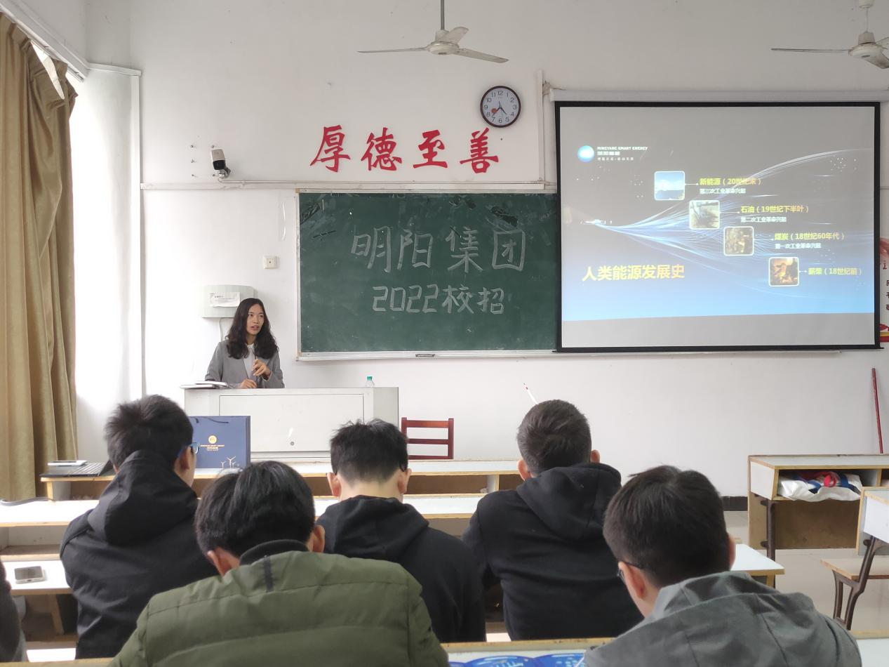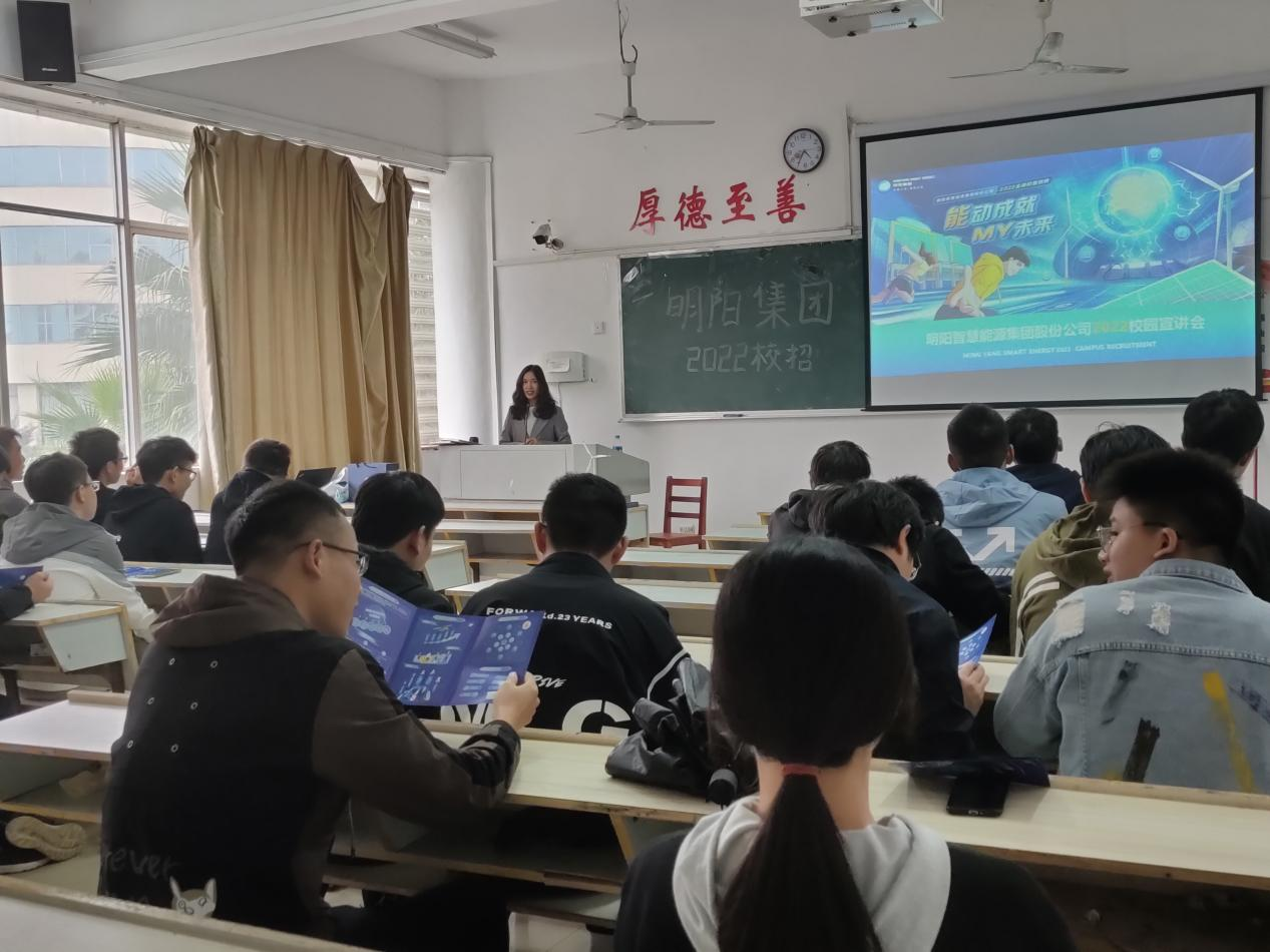 2021年10月22日下午16:00,机电学院于鼎新楼2216教室召开明阳智慧能源集团股份公司专场招聘会,2022届机械设计制造及其自动化、机械电子工程、电子信息工程专业毕业生参加了招聘会。该公司的HR经理崔雪玲给学生进行了宣讲。