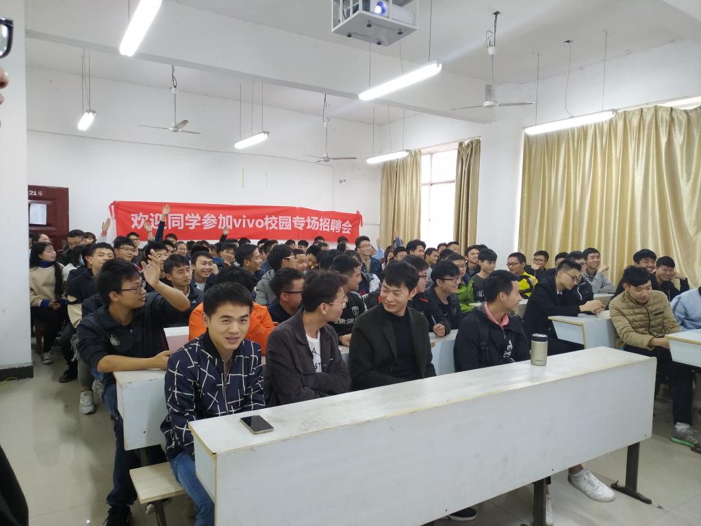 首先,vivo人事部的宣讲人打开公司宣传片,让学生们初步了解vivo;接着,宣讲人用PPT展示的形式向学生们介绍vivo的招聘部门、培训发展、薪资福利、培训发展等基本情况与文化,让同学们进一步了解公司;随之,宣讲人与学生们进行面对面解答疑问互动环节,同学们十分积极参与互动;最后,vivo人事部工作人员对有意向的同学们进行笔试面试。本次校园招聘宣讲会圆满结束。
