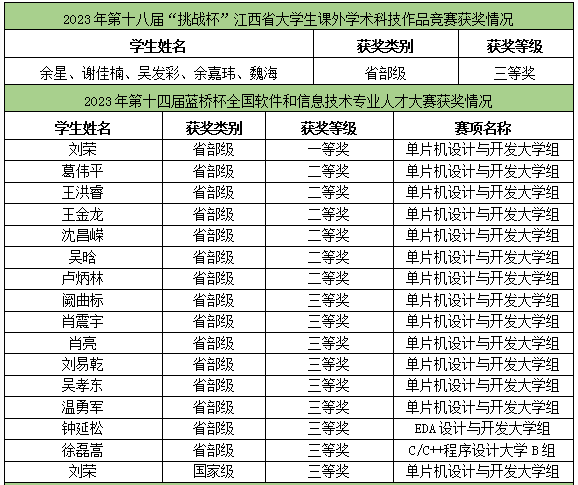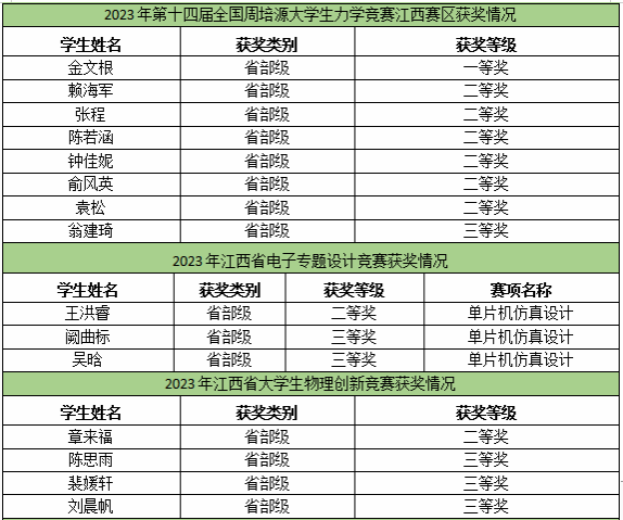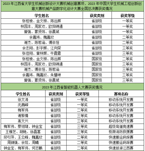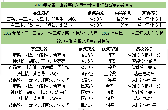 永利集团88304官网集团在学校领导的指引关怀下,在教务处等部门的大力支持下,积极开展学科竞赛相关工作,努力提升学生创新实践能力。2023年,永利集团88304官网集团结合应用型人才培养目标和能力素养要求,积极组织学生参加“挑战杯”江西省大学生课外学术科技作品竞赛、蓝桥杯全国软件和信息技术专业人才大赛、江西省大学生电子专题设计竞赛、江西省大学生力学竞赛、江西省大学生机械创新设计大赛、江西省大学生物理创新大赛、江西省先进成图技术与产品信息建模创新大赛、全国大学生先进成图技术与产品信息建模创新大赛、中国大学生机械工程创新创意大赛、江西省大学生工程实践与创新能力大赛、江西省智能机器人竞赛、中国大学生机械工程创新创意大赛、全国三维数字化创新设计大赛和中国大学生工程实践与创新能力大赛等十余项国家级、省级系列竞赛活动。