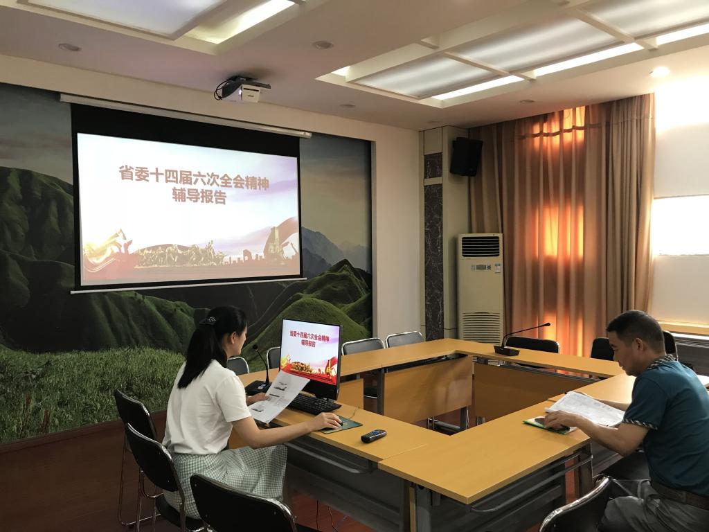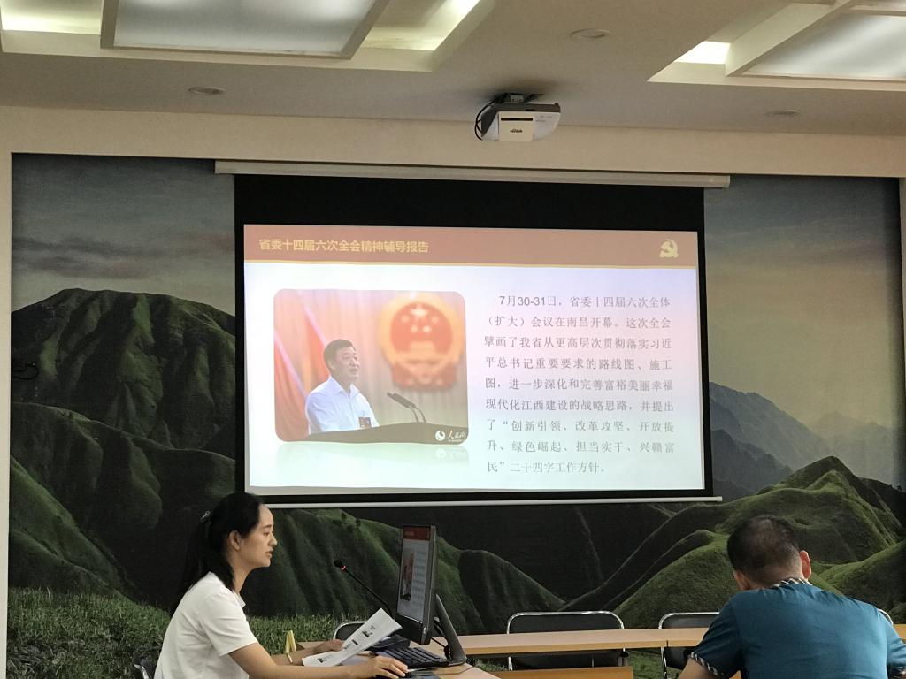 会议组织学习了省委书记、省长刘奇代表省委常委会所作的工作报告和在闭幕大会上的重要讲话。杨芳老师带领大家学习了省委十四届六次全会精神的主要内容,并重点阐释了“创新引领、改革攻坚、开放提升、绿色崛起、担当实干、兴赣富民”二十四字工作方针和“六大突破、三大提升”、“一圈引领、两轴驱动、三区协同”等一系列战略部署。倡导大家要进一步增强使命感和紧迫感,切实把思想和行动统一到中共省委的决策部署上来,拼搏奋进,真抓实干,不断提升履职能力,努力推进各项工作迈上新台阶。
