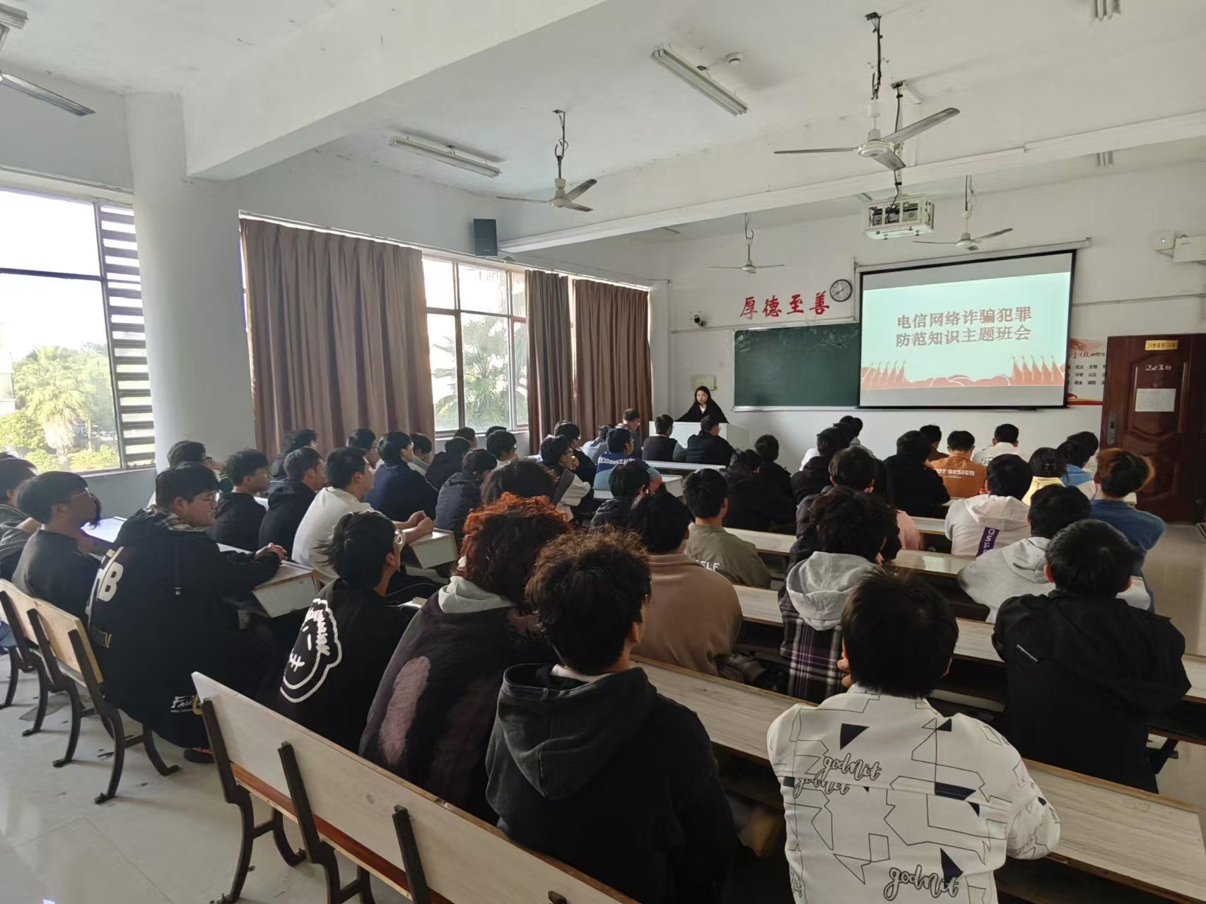 班会伊始,辅导员黄鸥老师介绍了当前网络安全形势的严峻性和电信网络诈骗的多样性。随后,通过案例分析等形式,向同学们展示了网络诈骗的常见手段、特点和危害,视频中的真实案例让同学们深感震惊,深刻认识到网络安全的重要性。