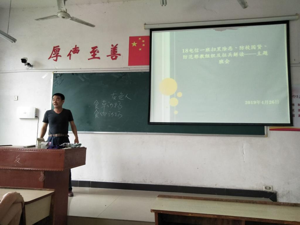 为打击校园黑恶势力,构建良好有序的和谐校园,18电信1班于4月26日下午在鼎新楼2314举行扫黑除恶主题宣讲活动。宣讲由机电学院院长苏啸主讲。