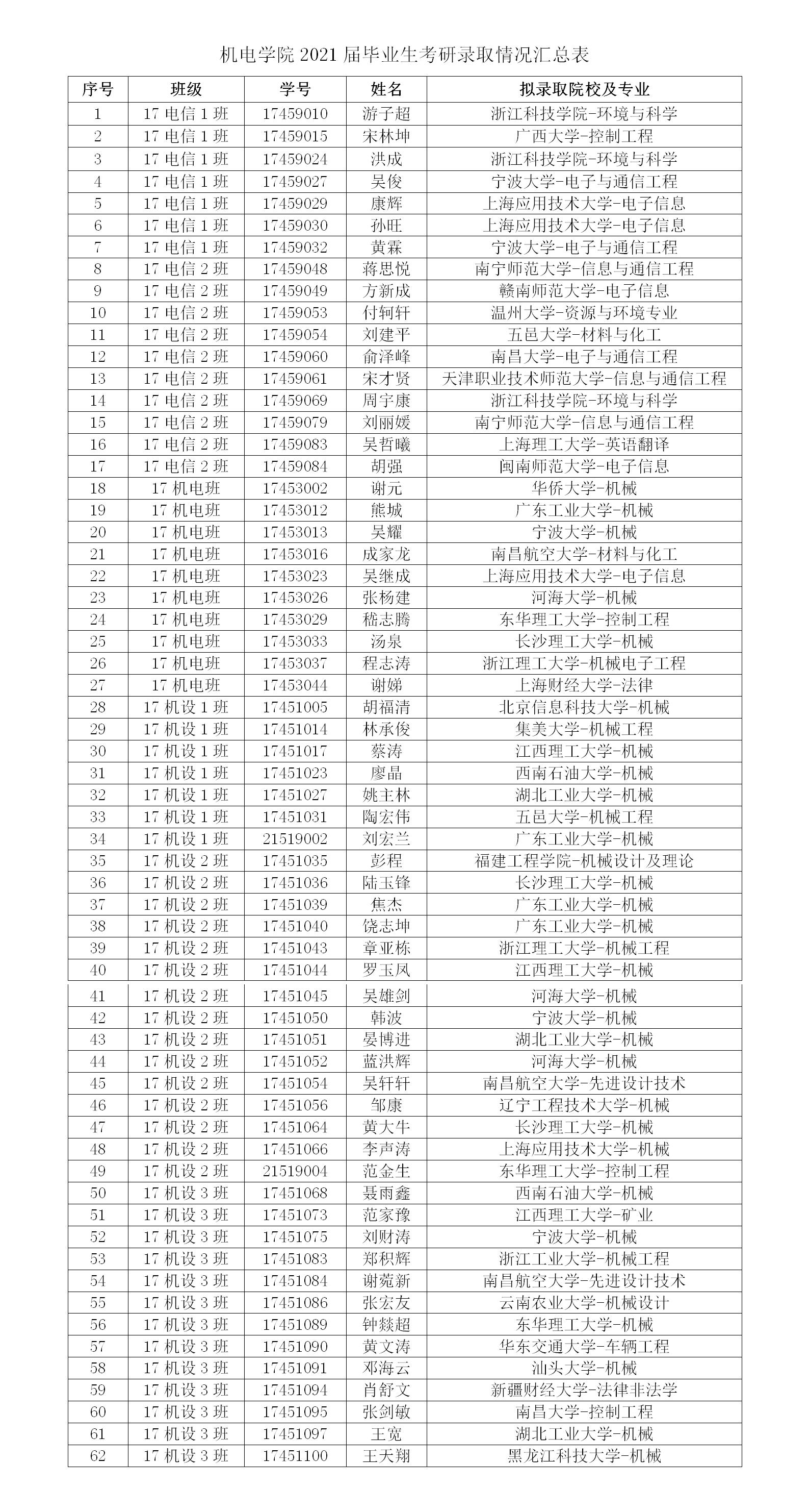 近期,随着全国各高校研究生拟录取结果的陆续公布,机电学院2021届毕业生考研战果捷报频传,现已有62名学生被录取为硕士研究生。今年的考研战果,不管是在考研录取的人数还是录取的质量上,都创造了近几年的最好成绩。据统计,永利官网2021届本科毕业生共242人,其中有98人参加了研究生考试,有67人过了国家线,现已有62人被录取,录取的学校不乏有上海财经大学、广西大学、南昌大学、河海大学等211院校。