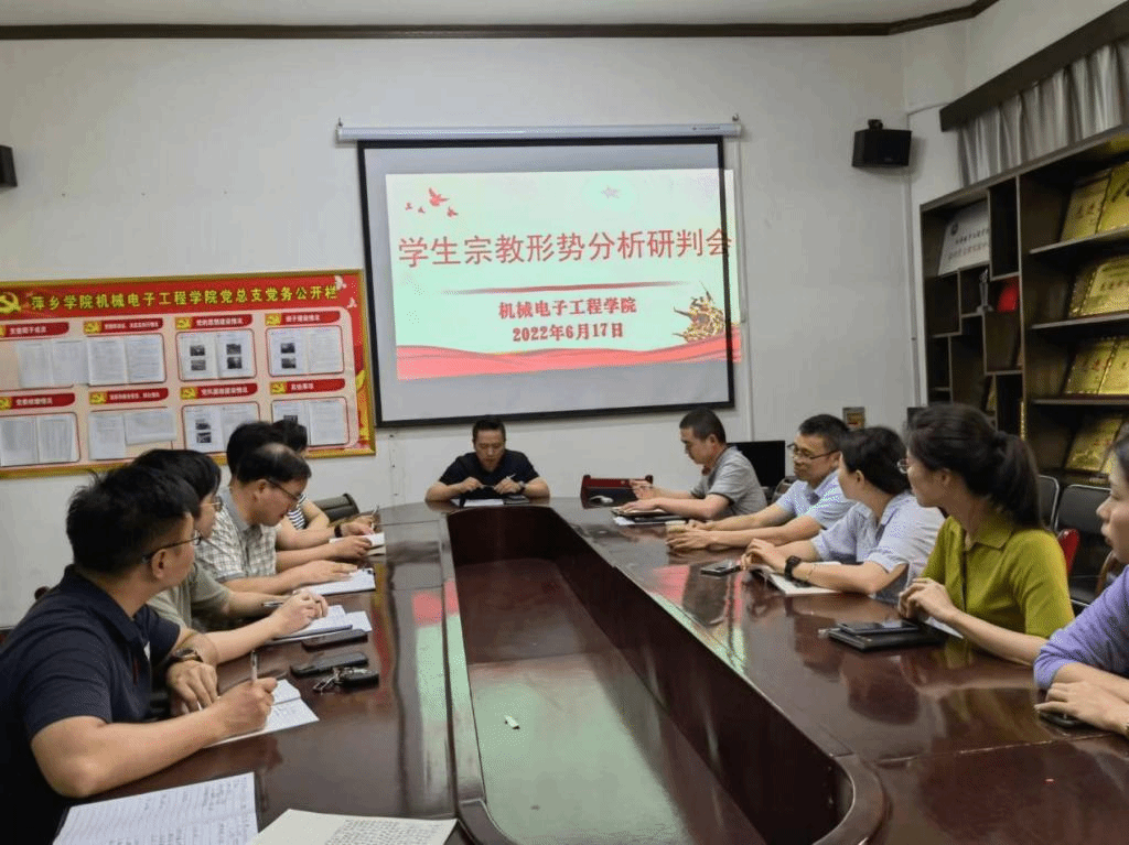 2022年6月17日上午,永利集团88304官网集团在党员活动室召开学生宗教形势分析研判会,机电学院全体专、兼职辅导员参加会议,会议由机电学院党委副书记童乐主持。