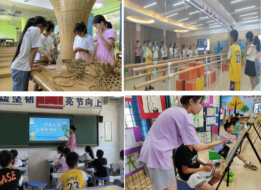 实践团走进张佳坊学校开展童心筑梦支教活动,助力乡村教育发展。来到学校后,实践团参观了学校的“竹韵”文化,并积极备课。上午主要是文化课,包括语文、数学、英语的教学辅导,夯实学生学业基础,下午是拓展课,包括美术、舞蹈、武术、朗诵、手工课等,激发孩子们学习的主动性、创造性。同时开展了红色文化教育宣讲、安全用电教育课堂、夏季防溺水安全课堂等,寓教于乐,引导孩子们快乐学习。
