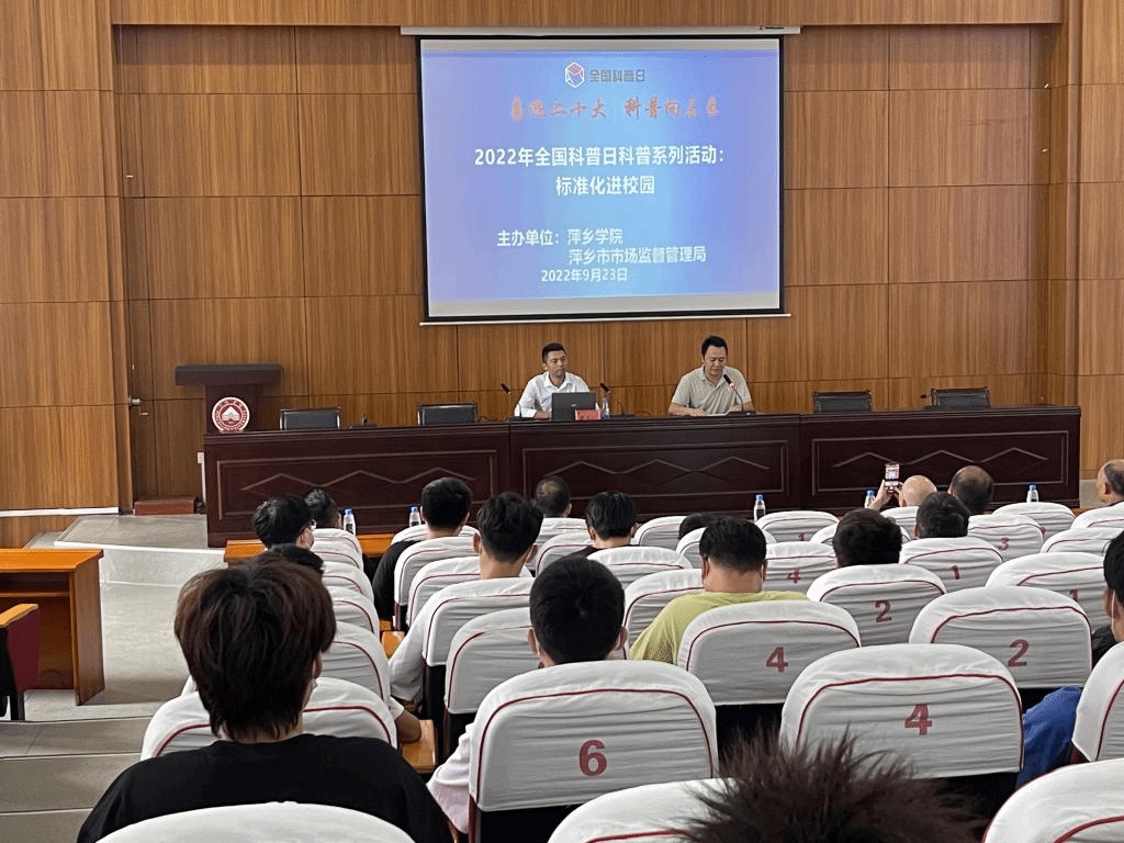 9月23日下午,我校在至善楼学术报告厅开展“2022年全国科普日科普系列活动:标准化进校园”专题讲座。讲座邀请江西省质量和标准化研究院质量和品牌研究中心主任、江西绿色生态品牌建设促进会秘书长周学礼主讲。机电学院党委副书记童乐、萍乡市市场监督管理局相关领导以及各二级学院师生代表参加讲座,机电学院院长李涛涛主持讲座。