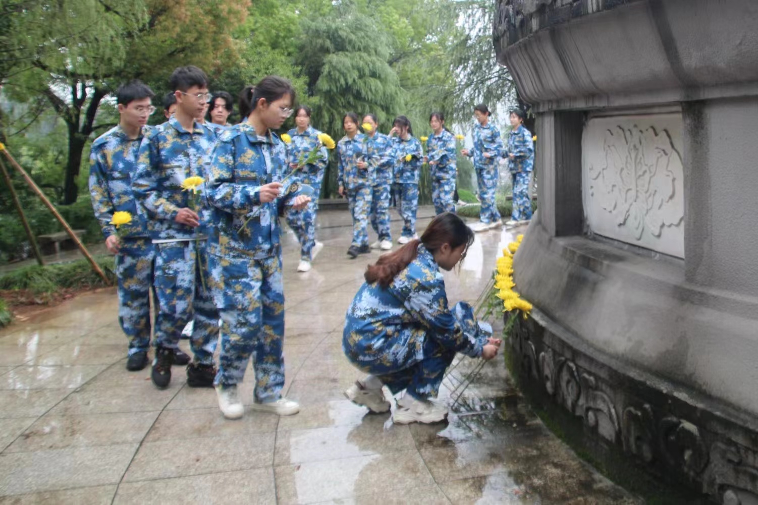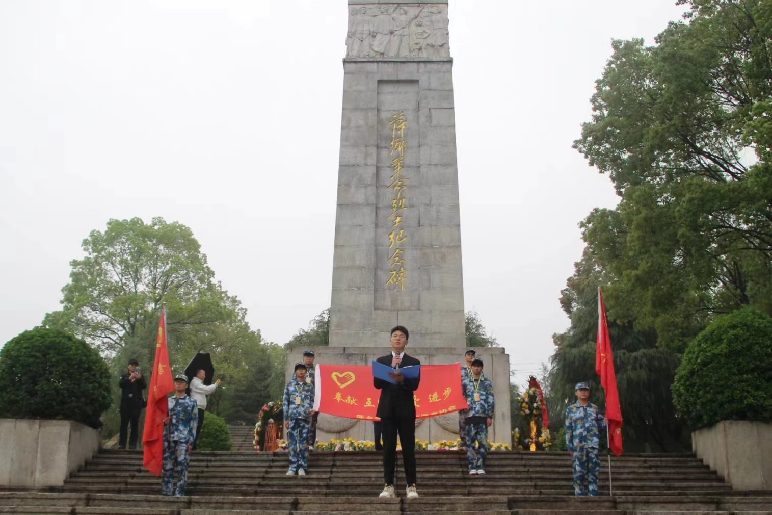 革命烈士陵园内苍松翠柏掩映、宁静肃穆,同学们静静地肃立在纪念碑前缅怀烈士的英雄事迹,表达自己对革命烈士崇敬的心情。在这庄严肃穆的氛围中,青年志愿者代表作了发言。而后全体志愿者成员围绕烈士纪念碑慢走一圈,瞻仰人民英雄事迹,并献上鲜花,最后全体志愿者向烈士纪念碑默哀一分钟。
