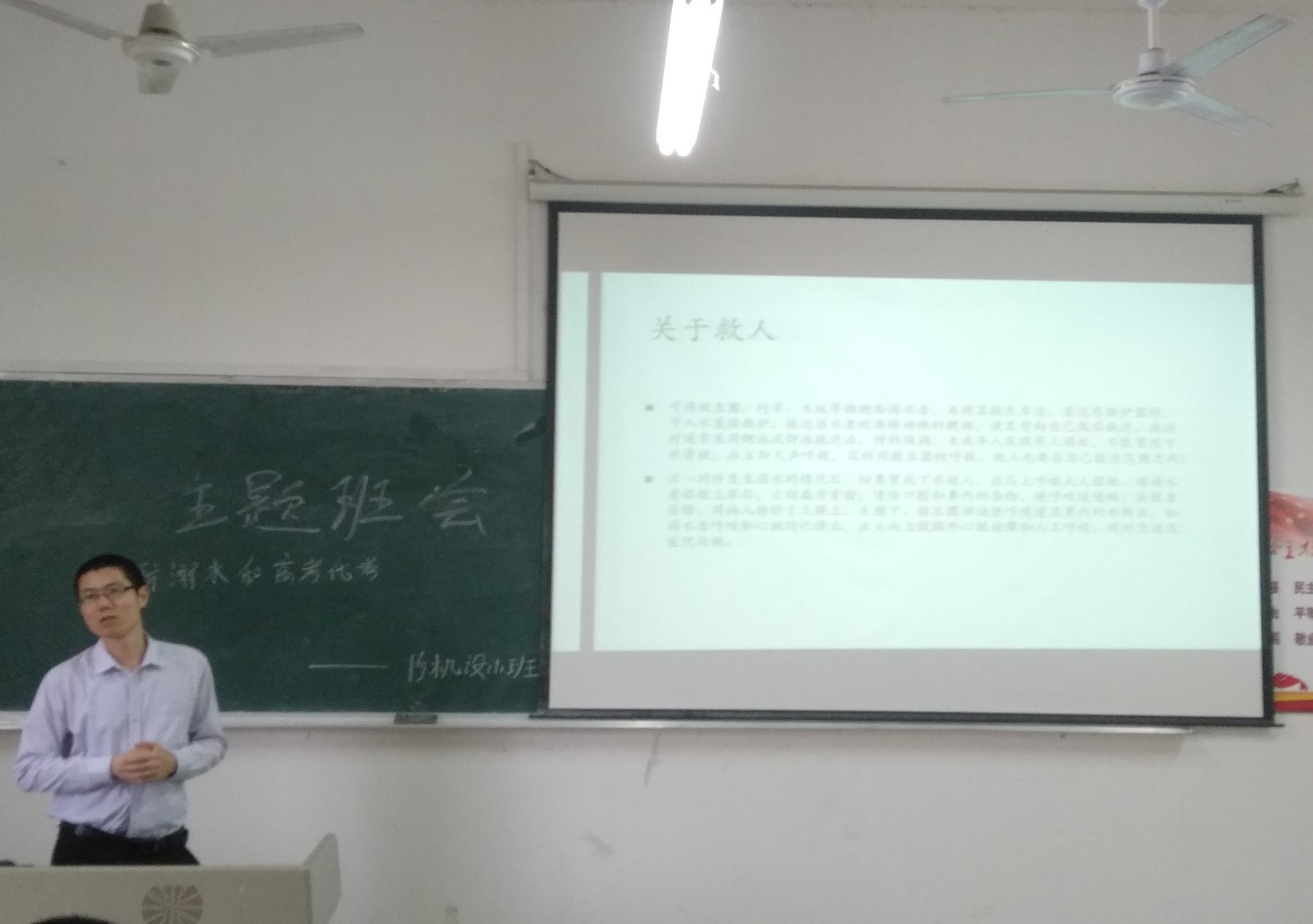 首先,班长武华中以溺水事件为楔子,通过PPT展示,使同学们深刻认识到生命的重要性与下河下海游泳的危险性,并且开展了如遇溺水自救方法与救人方法教学。同时进行了现场演示,使得我们学会了如何应对紧急情况并运用所学化解危机。接着,强调了我们防溺水的最重要的一点,那就是不下水才能完全避免溺水,在此,班上全体同学做出承诺:坚决不下河下海游泳,不在危险水域嬉戏打闹。相信在我们班会过后同学们一定都会远离溺水的危害。