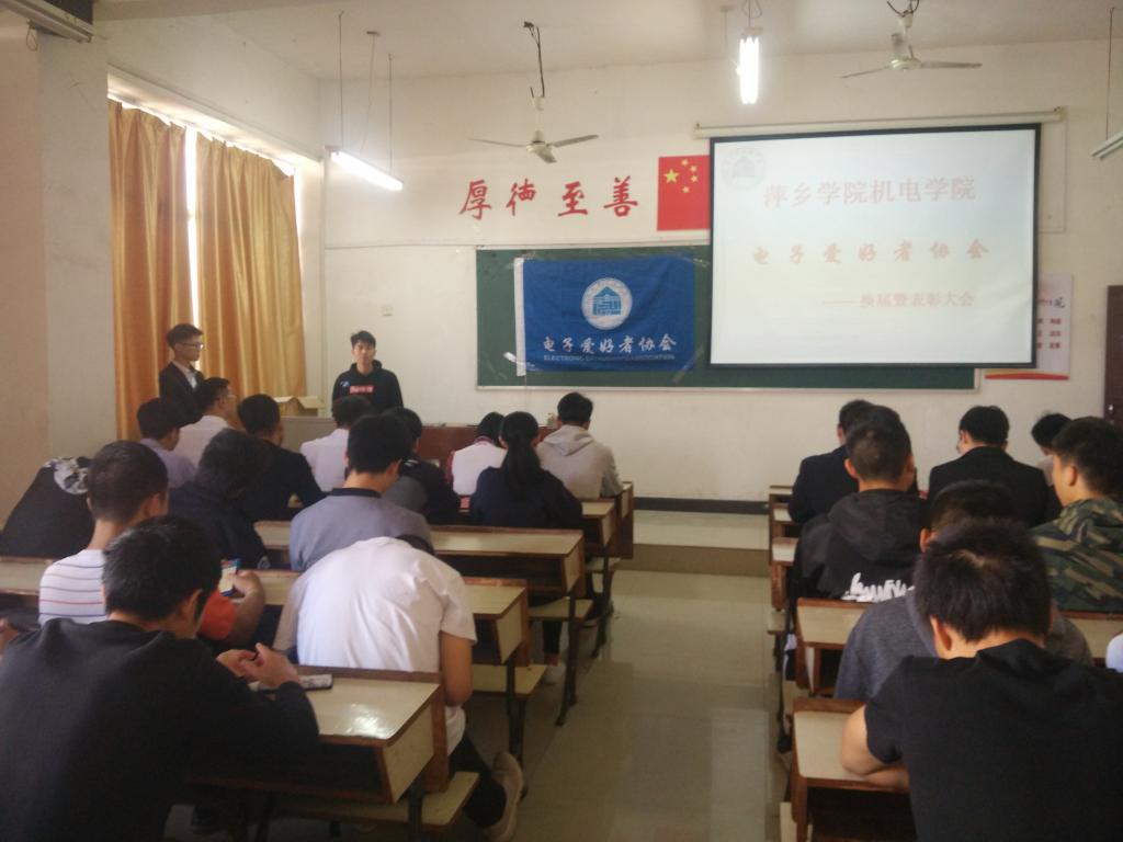 2018年11月1日中午,机电学院电子爱好者协会2018年度换届大会于鼎新楼2314教室顺利举行。协会指导老师胡子健老师出席,协会会长徐家龙、各部门部长助理及18级电协新成员参会。