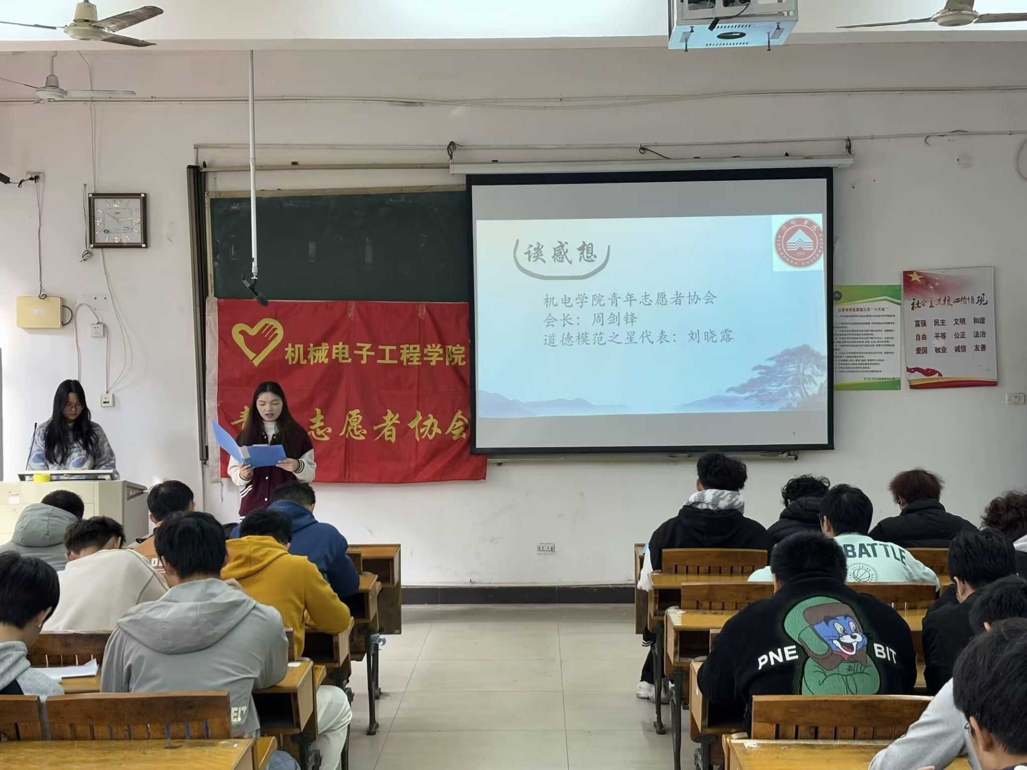 本次活动围绕“诵经典、评模范、谈感想、鞠躬礼、送吉祥”等环节展开。全体起立齐唱《爱的奉献》,朴素温暖的歌词迅速打开了在场观众的心扉。接着大家跟着屏幕一起观看了2024年度全国教书育人楷模萍乡芦溪特殊学校校长刘小清的故事短片,故事打动了在座所有人。在“评模范”环节中,朱慧琳、钟金宝、罗定鑫等12名同学被评为学生道德模范。他们用实际行动诠释了什么是真正的志愿服务精神。他们有的积极参与社区帮扶,为孤寡老人送去温暖;有的投身环保事业,倡导绿色生活理念;还有的在校园内外开展公益宣传,传递正能量。他们的无私奉献和默默付出,赢得了师生的广泛好评。在表彰仪式上,道德模范们也分享了自己的志愿服务经历和心得体会。他们表示,志愿服务不仅让他们收获了成长和快乐,更让他们深刻体会到了帮助他人、奉献社会的意义和价值。同时,他们也鼓励更多的青年志愿者加入到志愿服务行列中来,为构建和谐社会贡献青春力量。