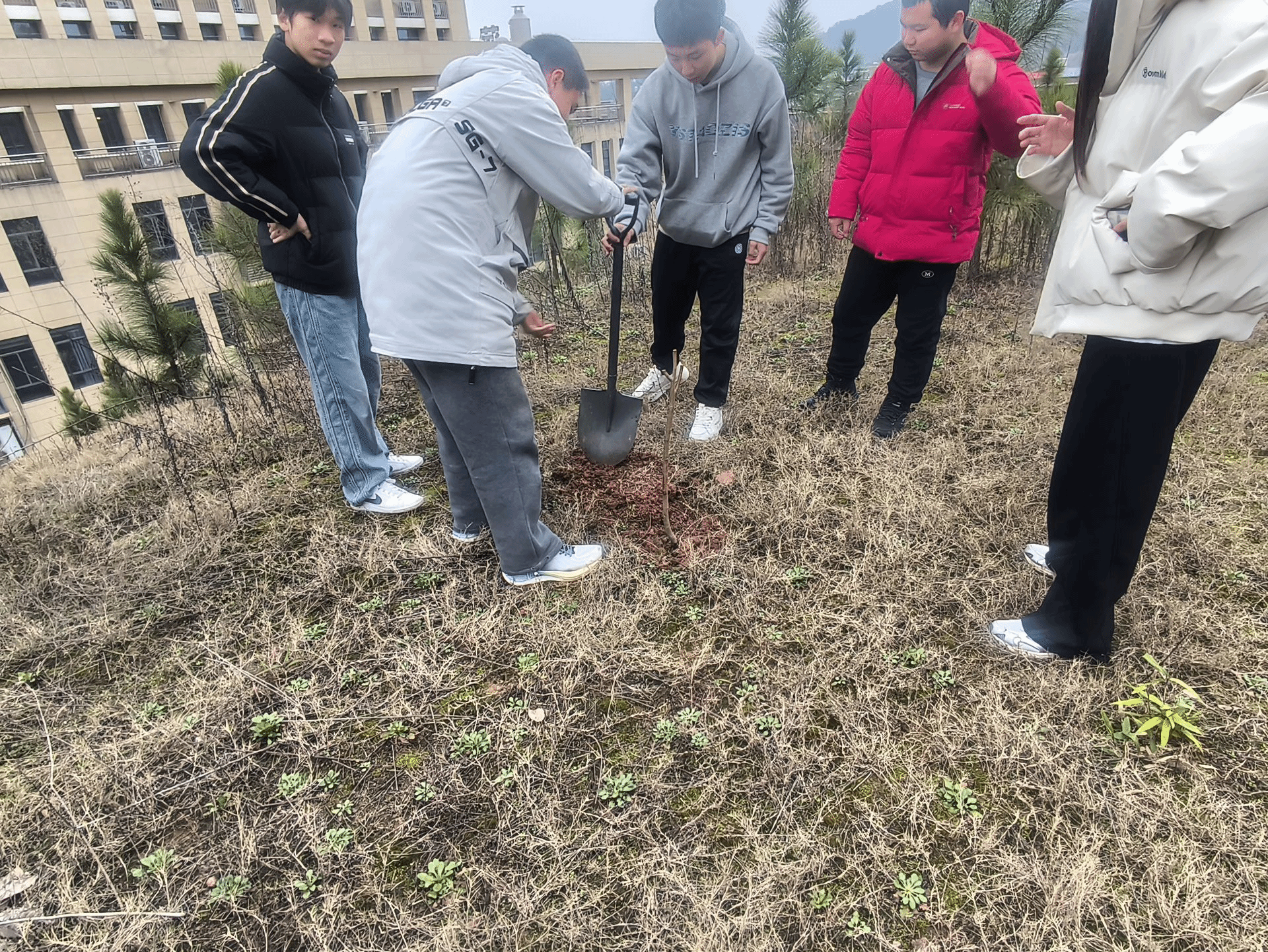 在至善楼后面的植树现场,老师和同学们分工协作,默契配合,共同挥锹铲土,挖出一个个合适的土坑,为种树做准备。经过学生们的辛勤劳动,一棵棵小树苗迎风挺立,为校园增添了一抹靓丽的色彩。此刻,大家脸上洋溢着憧憬与期待,当来年小树苗茁壮成长,那挺拔的“身影”定会让种树人感到骄傲。植树节,在校园里有着独特的意义。它是一堂生动的自然教育课,课本上抽象的植物知识,在亲手植树的过程中变得鲜活。当我们拿起铁锹,铲起泥土,种下树苗,便与大自然建立起直接的联系,深刻理解生命成长的不易。