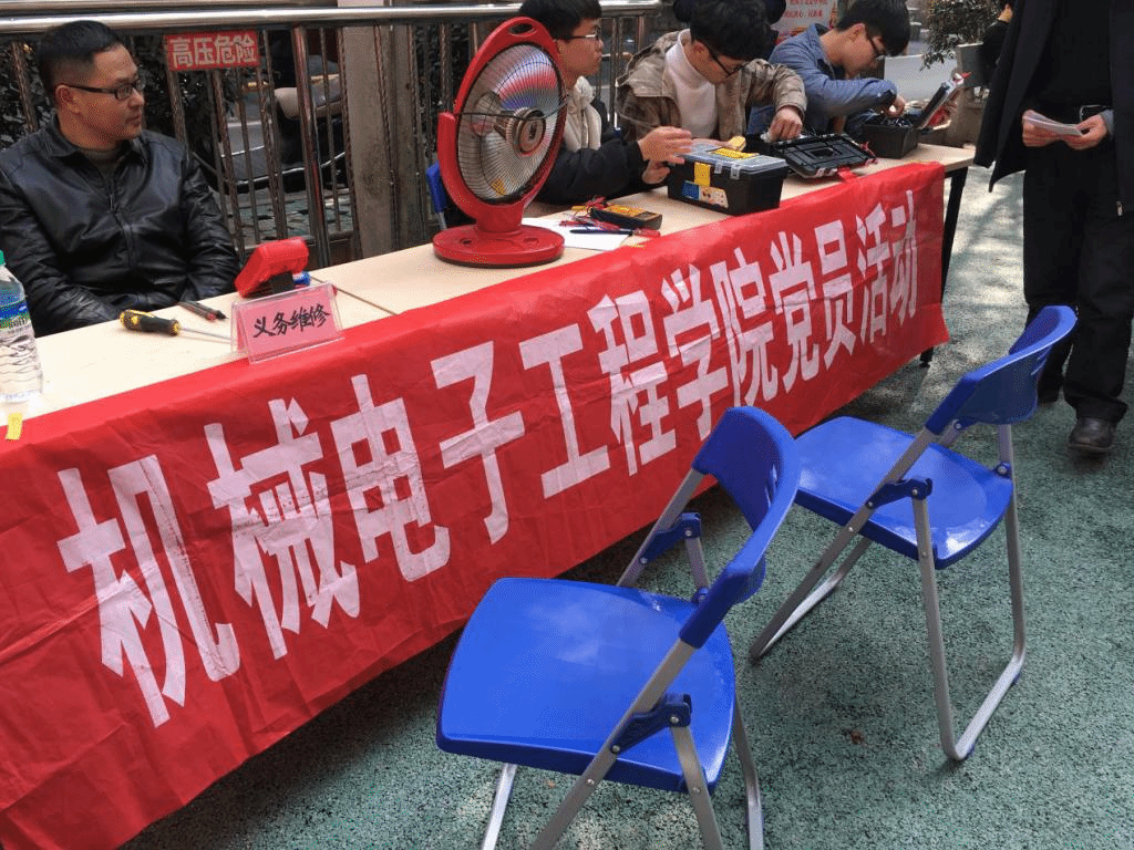 机电学院学生党支部以社团为志愿服务平台,充分发挥学生党支部的战斗堡垒及党员的先锋模范作用,围绕“志愿服务”的主题开展了形式多样、效果显著的活动,取得了良好的效果,义务维修进社区已成为常态化的志愿服务活动。这正是机电学院党建特色品牌建设项目“依托“党旗+平台+工程+保障”党建模式,充分发挥党员先锋模范作用”的成果之一。