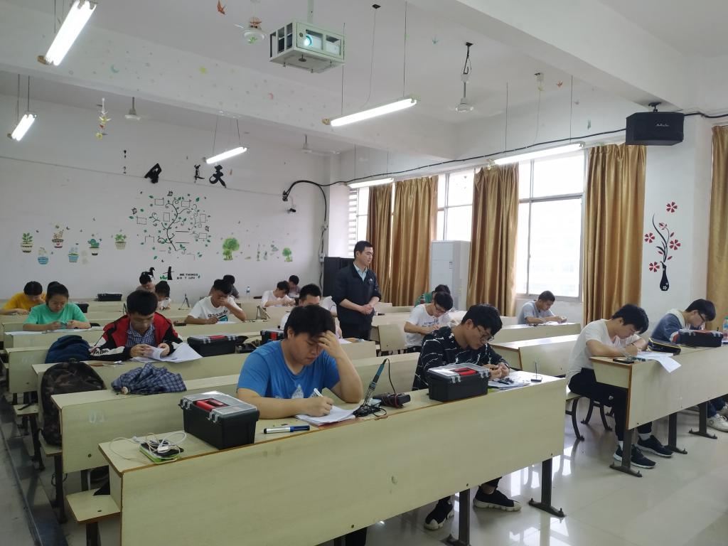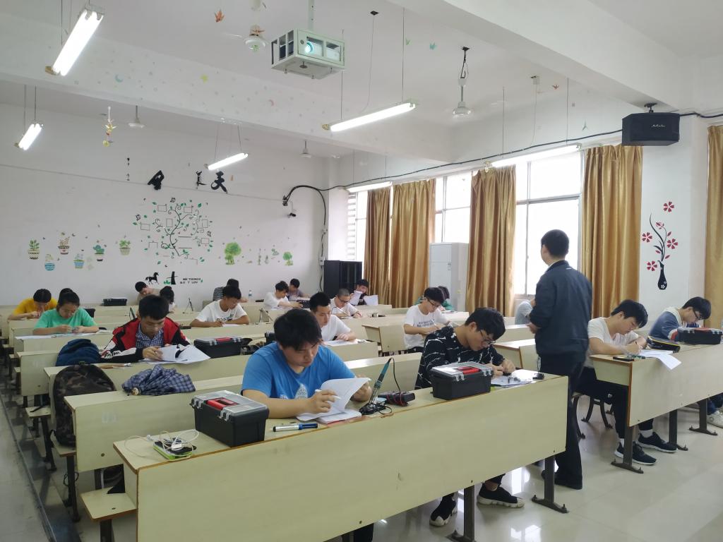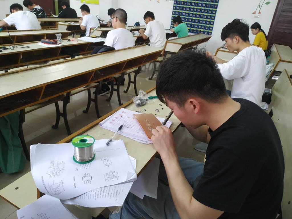 本次比赛的题目为出入口检测装置设计,竞赛开始后,参赛选手认真查看器件清单与实物,看着试题要求开始沉浸思考如何设计。竞赛时间长达七个半小时。赛场上,参赛者们翻阅自带的资料,在画图纸上画电路图,认真思考,沉着应战,比赛紧张而有序的进行,每名参赛选手都专心致志于自己的工作,争取在规定时间内完成焊接任务。下午四点,竞赛准时结束,胡子健老师指出竞赛过程成中存在的不足,望同学们好好总结,以最好的状态参加省级比赛。