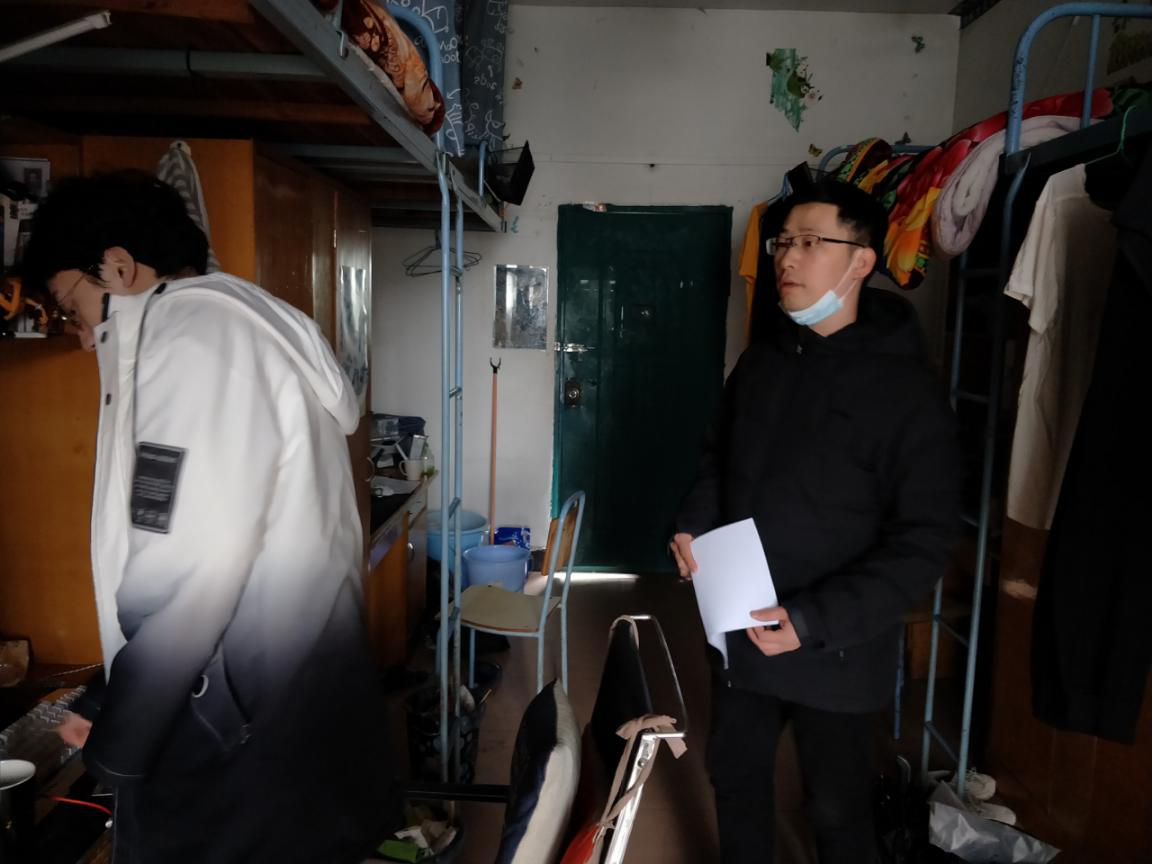 1月7日上午,辅导员童乐、张陆、罗钦艳深入走访男生宿舍7栋,了解学生在宿舍的学习生活情况,并叮嘱同学们要严格遵守学校规章制度,注意用电安全,杜绝在宿舍内存放、使用大功率违章电器。