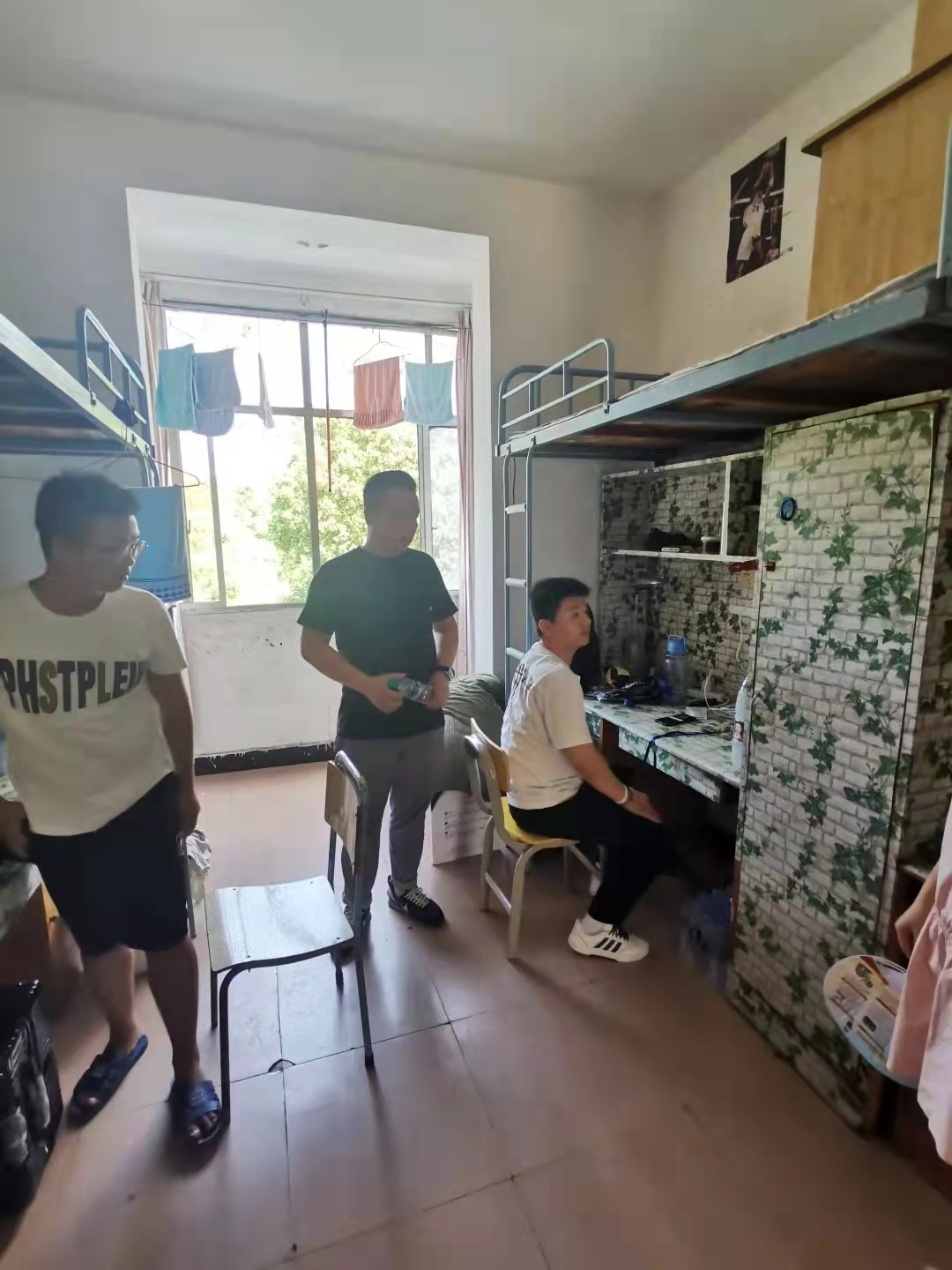 童老师在寝室询问了同学们对校园适应情况、日常生活中遇到的问题并给予了生活建议,并对寝室卫生进行检查。他强调,一定要注意寝室安全,不用违规电器、不晚归,同时要注意保持室内清洁以及日常通风营造积极健康的宿舍文化,保持身心的健康发展。