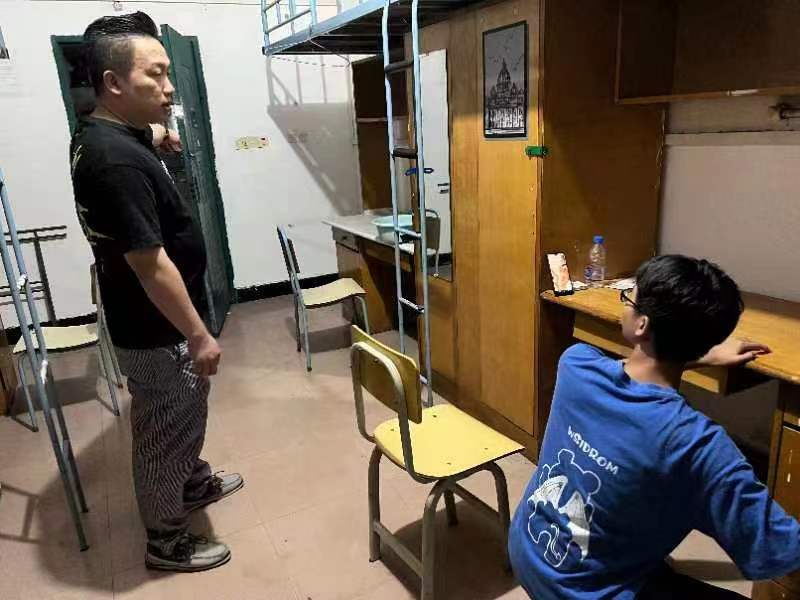 走进宿舍,童老师细心观察学生的住宿环境,叮嘱学生们定时开窗透风。看见学生桌上放着的一叠书和资料,童老师老师亲切询问他的学习情况,“安全和健康是最重要的,其次,要树立明确的目标,在学校里要发奋学习,掌握本领,学习生活上但凡有什么问题,都可以和我们交流。”